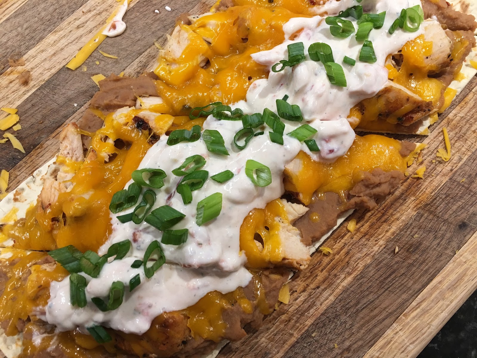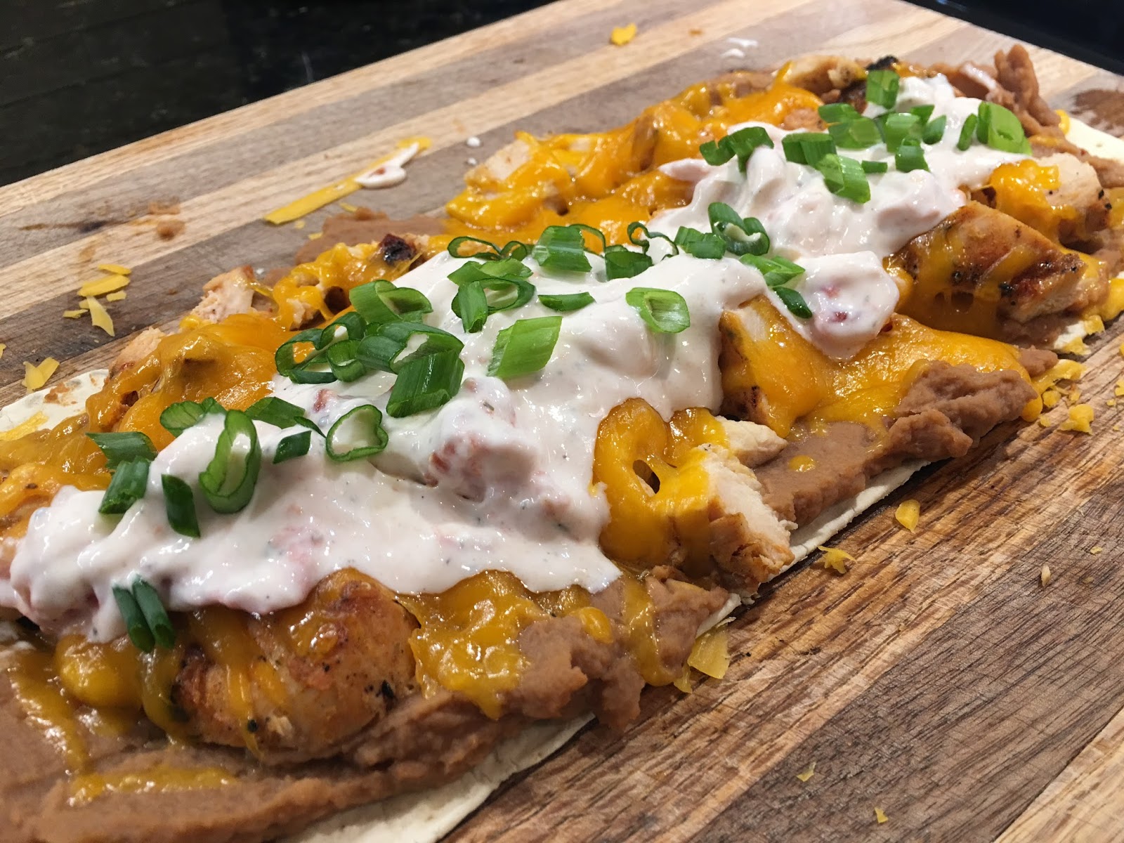 Turn your oven to 350 degrees. Lay your tortillas out on a baking sheet. Smooth beans out on to each tortilla, followed by chopped grilled chicken and cheese. Place in oven for 10 minutes (even if your oven isn’t preheated! Which, it shouldn’t be… That didn’t take too long to assemble!).