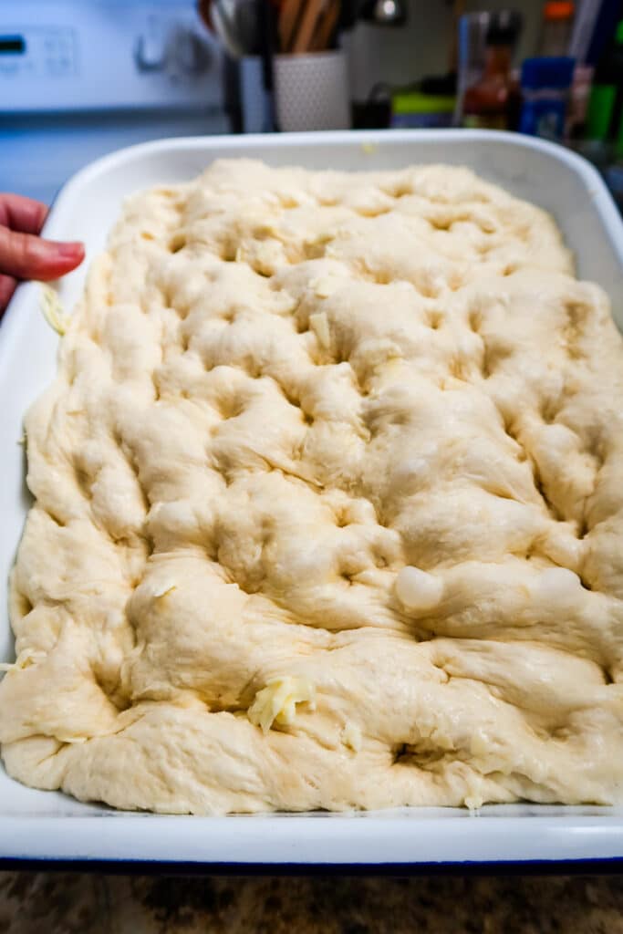 When your dough is ready for the baking dish, you’ll let it proof for 90 minutes, and I like to use a mixture of olive oil AND melted butter on the bottom of the pan.