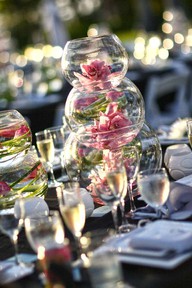 THIS! This, I love. I love the unusual use of the vasey-bowls. Placing flowers topped with water, and stacking the three sizes. Using interesting items on your table not only captivates your guests, it sparks conversation. When you set your table,