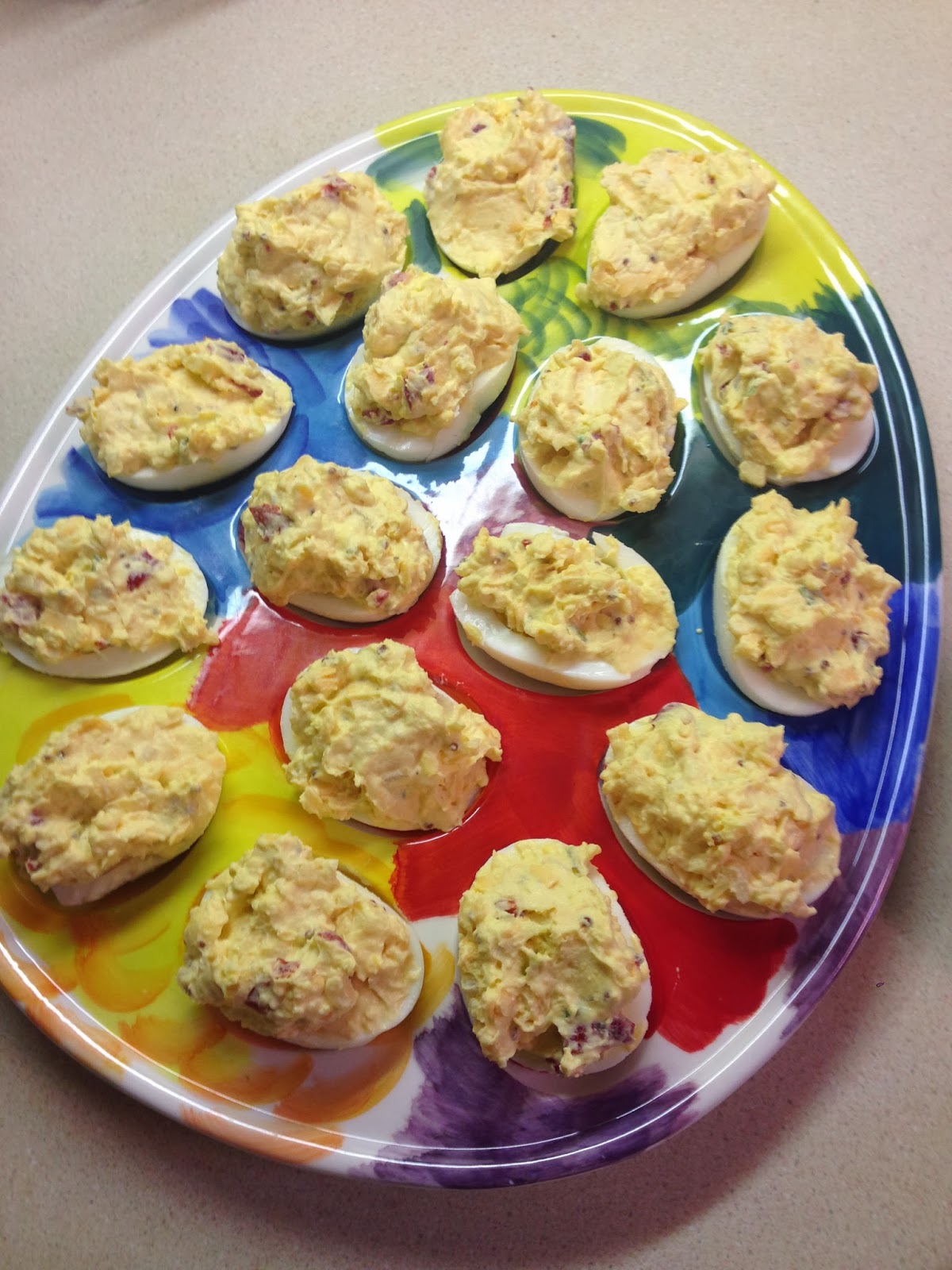I had some leftover Pimento Cheese, and while making Mama some deviled eggs for her party tomorrow, I thought I’d plop some in. Deviled Eggs in this house will never come with out pimento cheese now… They are THAT good.