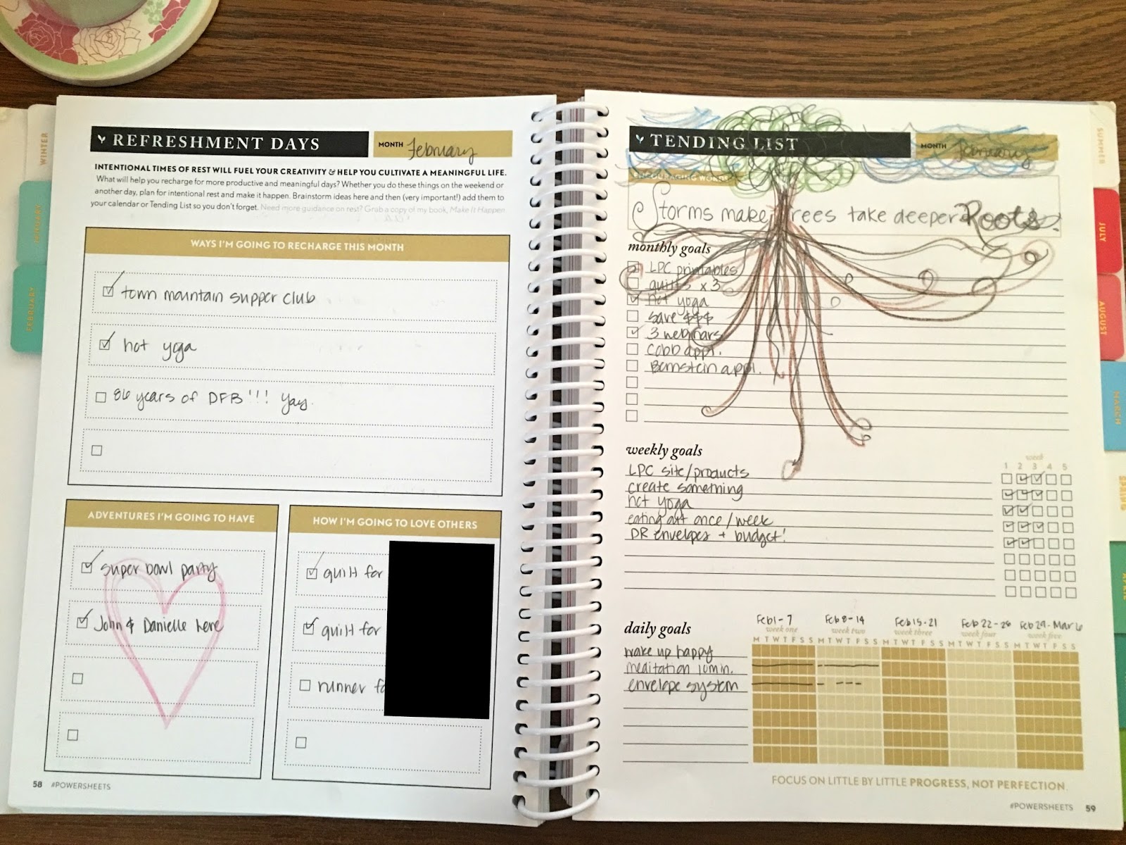 Next couple pages you spend some time writing your thoughts and feelings…. And, recollecting on the month passed. THAT was so helpful… And, each month I almost wrote the exact same thing…. ((It takes me a while to learn….!)) Then, you move onto the Tending List. Fill this in using the goals you set at the beginning of the year…. I like to doodle all over!
