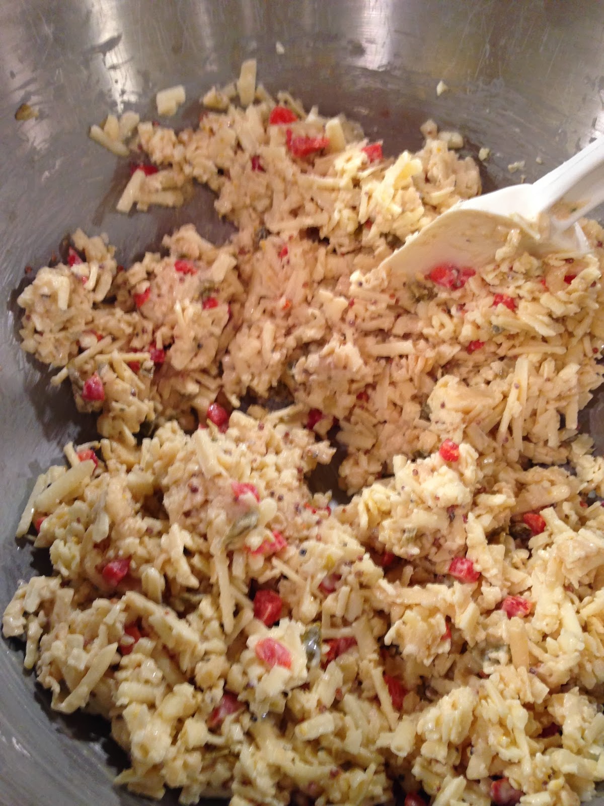 In a smaller bowl, add pimentos, jalapeños, mayo, mustard, worcestershire sauce, and black pepper. Whisk till combined.