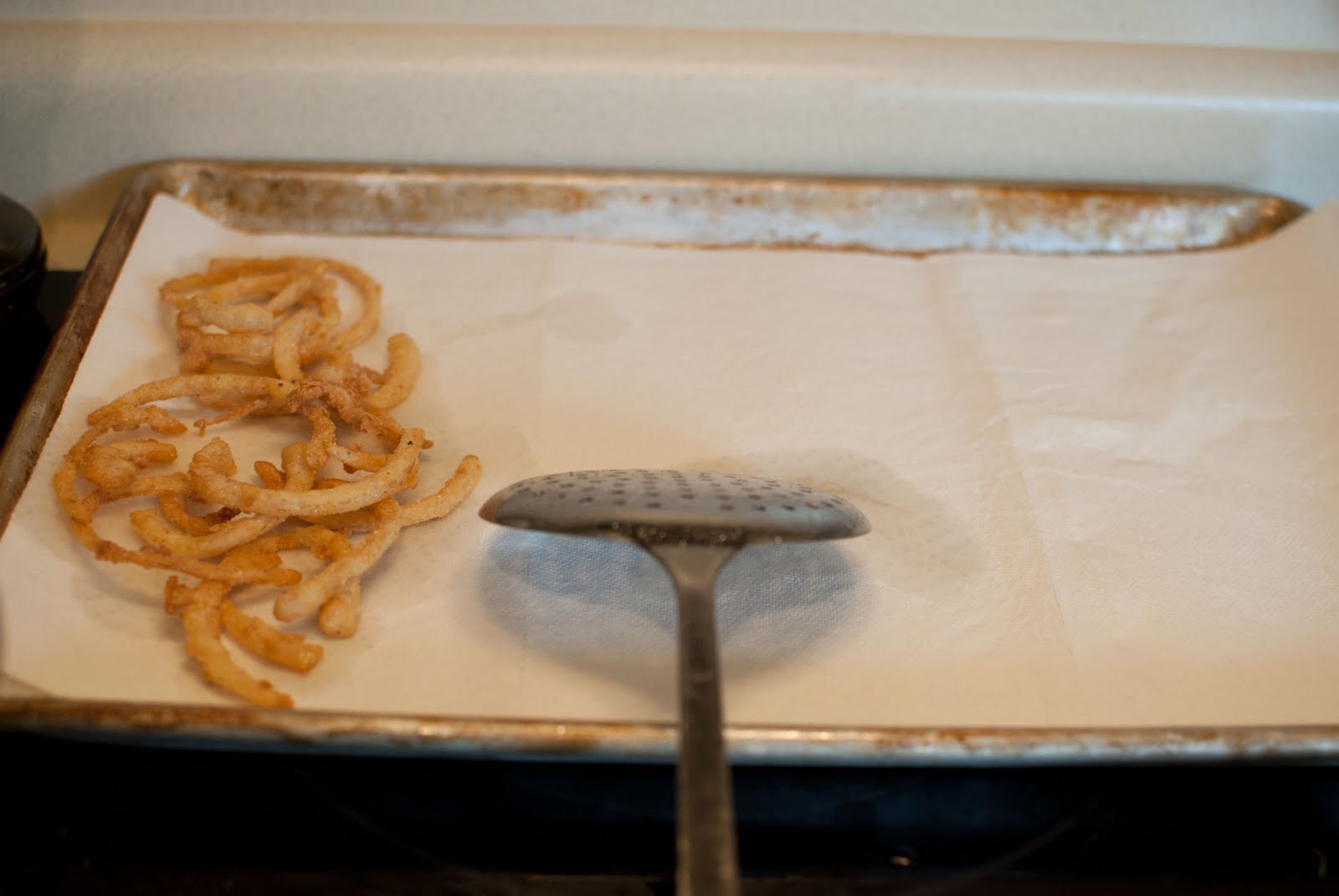 Nowwww, for the fried onion strings….. These little yummies are addicting, so be careful.